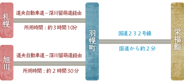 羽幌町へは、道央道から深川留萌自動車道で【留萌大和田I.C.】をお降りください。留萌市より国道232号線を約50km北上してください。